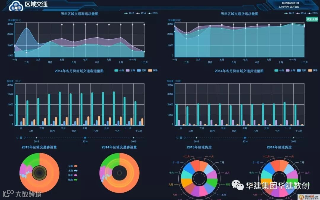 区域交通,以全屏指标图表展现区域交通的综合运行状态。可展示每月客货运总量面积图、公路、水路、民航、铁路各月的客货运量柱状图,以及年度各月的客货运量分布饼图。