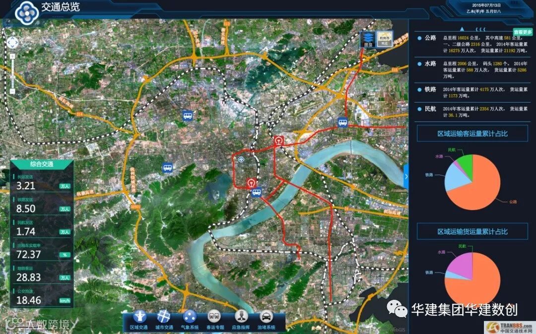 交通总览,在地图上点击各接入视频点,即可查看该摄像机的实时画面。图中展示了某高速路段视频图像。下图中为卫星图,展示交通总览,包括公路、铁路、水路、民航的客货运量信息,及各运输方式的客货运量占比饼图。