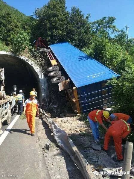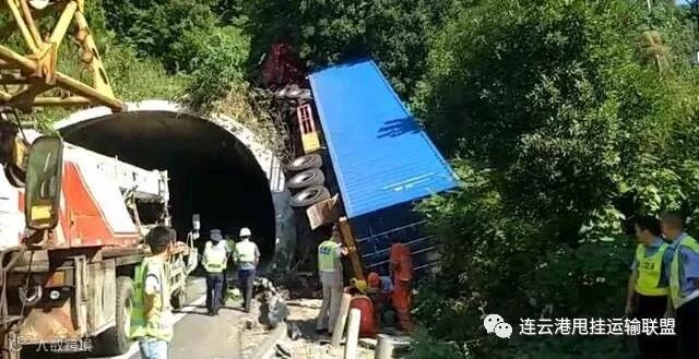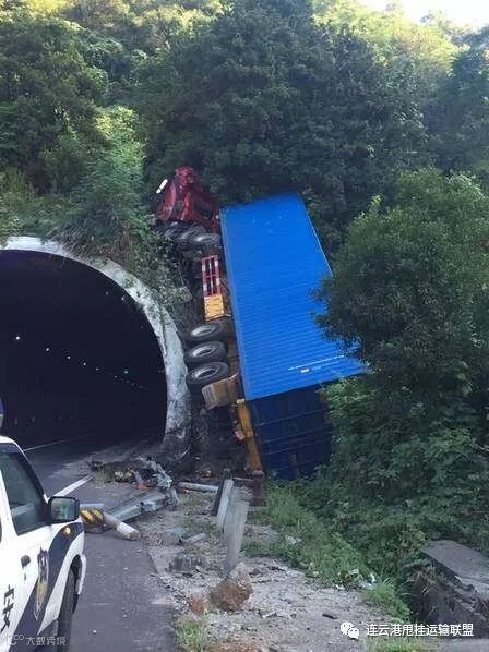 浙江台州G15沈海高速麻岙岭隧道南洞口路段发生一起惊险车祸:一辆安徽牌照的集装箱运输车在行驶中突然失控,撞上隧道右侧的山体后,整辆车侧翻“骑”在山体上。