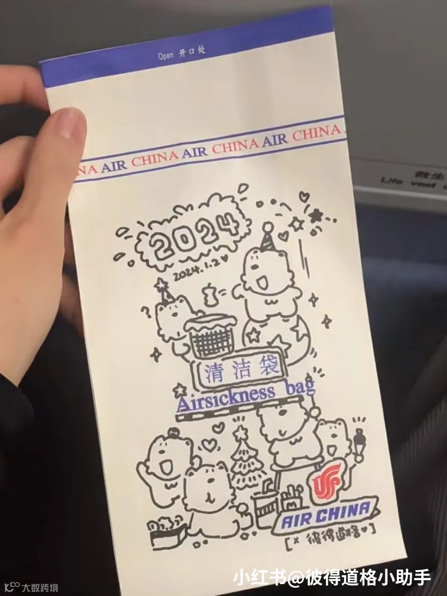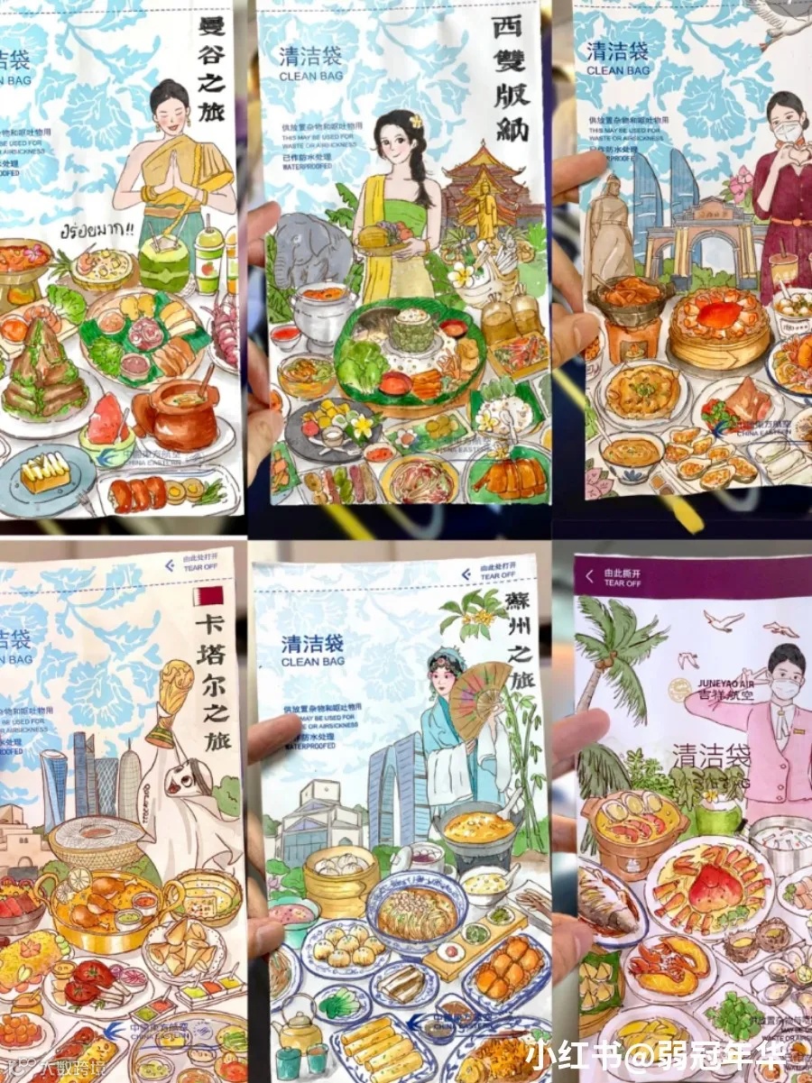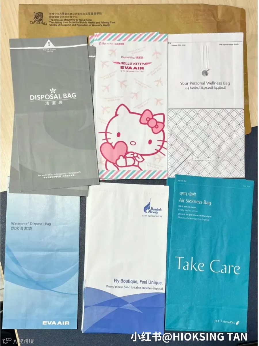每个航司的清洁袋各有不同,而且经过一段飞行旅途后,清洁袋就可能变身成为艺术品,超有纪念价值!