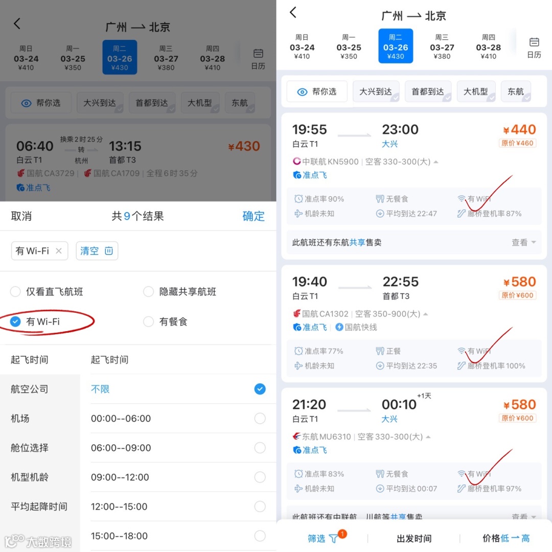 飞常准可筛选出【有WIFI】的航班,或者登录航司官方网站查询。还可在官网查看是否有活动可以领取免费WIFI使用时长,另外航司会员还可以用里程兑换WIFI时长。
