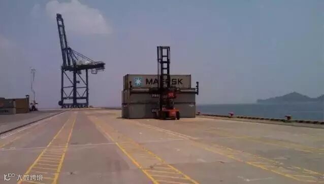 6、来到码头,负责吊柜的“麻鹰”会找到相应船公司的柜子,吊到车上。