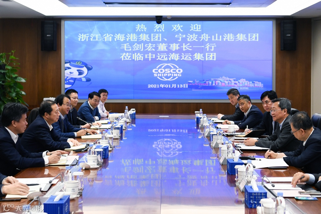 1月13日,浙江省海港集团、宁波舟山港集团党委书记、董事长,宁波舟山港股份有限公司董事长毛剑宏,集团总经理、党委副书记、董事陶成波拜会中远海运集团董事长、党组书记许立荣,中远海运集团董事、总经理、党组副书记付刚峰。双方进行了友好深入的会谈。