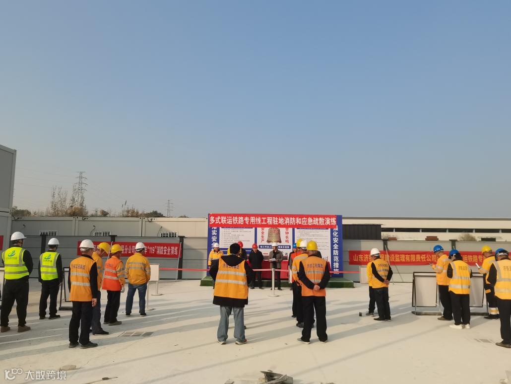 11月是全国消防宣传月主题。为做好消防安全宣传工作,保障项目建设安全有序推进,近日,泰安市多式联运物流有限公司牵头开展了铁路专用线工程驻地消防和应急疏散联合演练。
