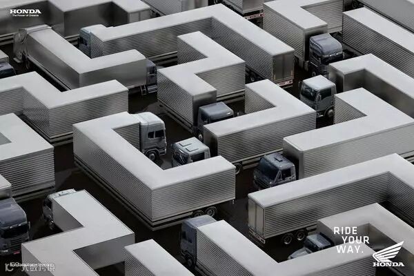本田摩托车广告,将货车变成迷宫的样子,来比喻拥挤的交通,这个时候,想要上班、约会不迟到,就骑摩托车吧!