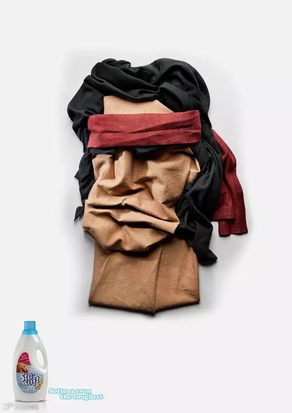 StaSoft洗衣液广告,用柔软的布料摆成史泰龙的形象,意思是,即使最粗糙的面料,也有办法能让它柔顺起来。