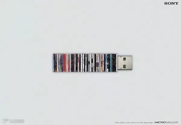 索尼U盘广告,用CD堆砌成U盘的外壳,寓意着“U盘的出现,淘汰了CD”。