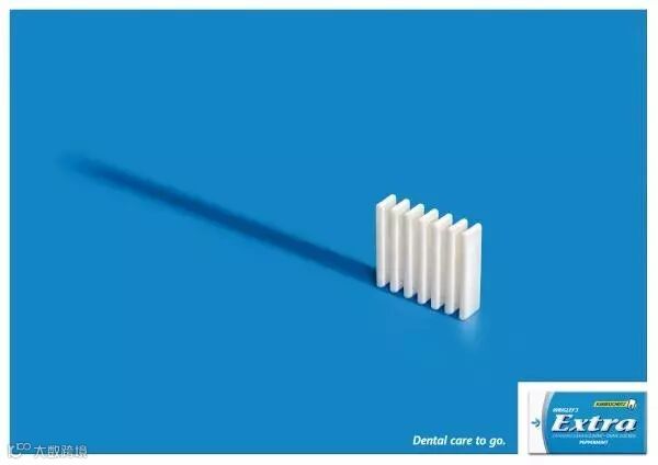 益达口香糖的广告,用口香糖以及倒影形成牙刷的形状,意在说明,口香糖跟牙刷一样,对保护牙齿有好处。