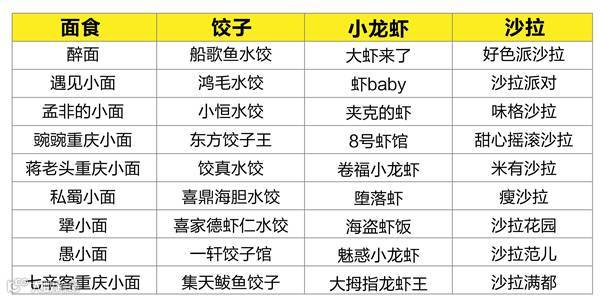 它们喜欢用“品牌+品类”的取名方式,让人一眼就知道这家店卖啥。餐厅主打单品集中在面食,饺子,小龙虾,沙拉等。比如主打面食的餐厅有:孟非的小面,豌豌重庆小面,愚小面,七辛客重庆小面......