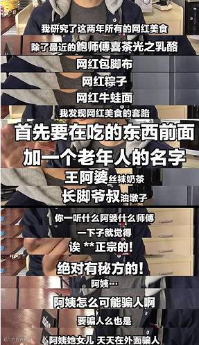 有人总结了网红美食的爆款套路:在吃的东西前面加一个老年人的名字,比如胖阿姨香酥鸡,王阿婆丝袜奶茶.....一听到什么阿姨啊什么师傅啊,让人不禁感觉——“哇,够正宗,绝对有秘方!买买买!”