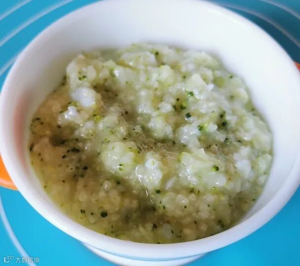4.银鳕鱼肉和西蓝花碎倒入小米粥,再煮1分钟;