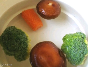 西蓝花少许、蘑菇2个、胡萝卜一小段、猪里脊200g、馄饨皮、鸡蛋1个、DHA核桃油。