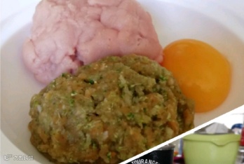 4.在食材中加入1个蛋黄、3-4滴核桃油和少量水,顺时针搅匀。