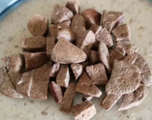2.猪肝煮3分钟左右,捞出,放凉切粒。