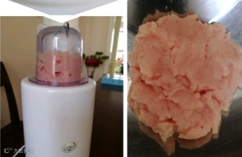 2.猪里脊切小块,去除筋膜,再用料理机打碎。