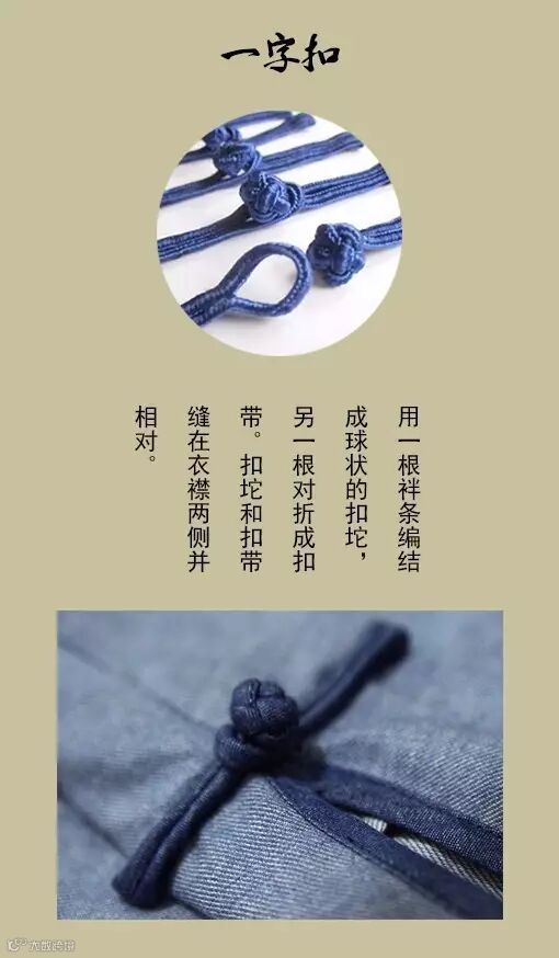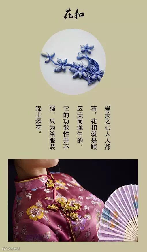 盘扣有其特殊的工艺性,它运用细腻、婉约的手工扦边和盘花扣,表现出一丝不苟的自我涵养,精巧的盘扣中蕴含着精致。在形形色色的传统汉服中,衣襟上的盘扣常常起到画龙点睛般的传神作用,民族风韵浓缩其中。