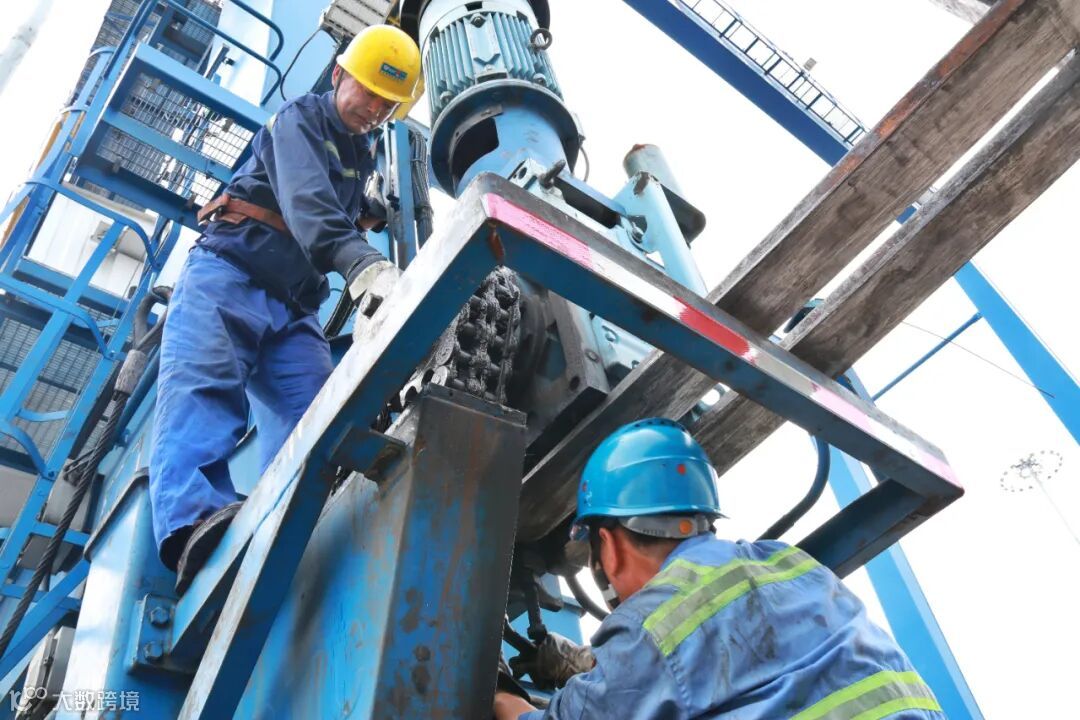 在龙门吊行走链条抢修现场,温州港集团两名配对的机械维修员正顶着炎炎烈日,熟练地拆除大车减速箱。