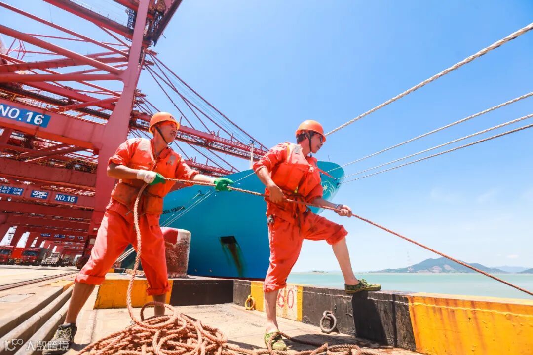 骄阳当空,穿山港区集装箱码头的码头水手们正在奋力拉缆绳,只为确保船舶安全靠离泊。