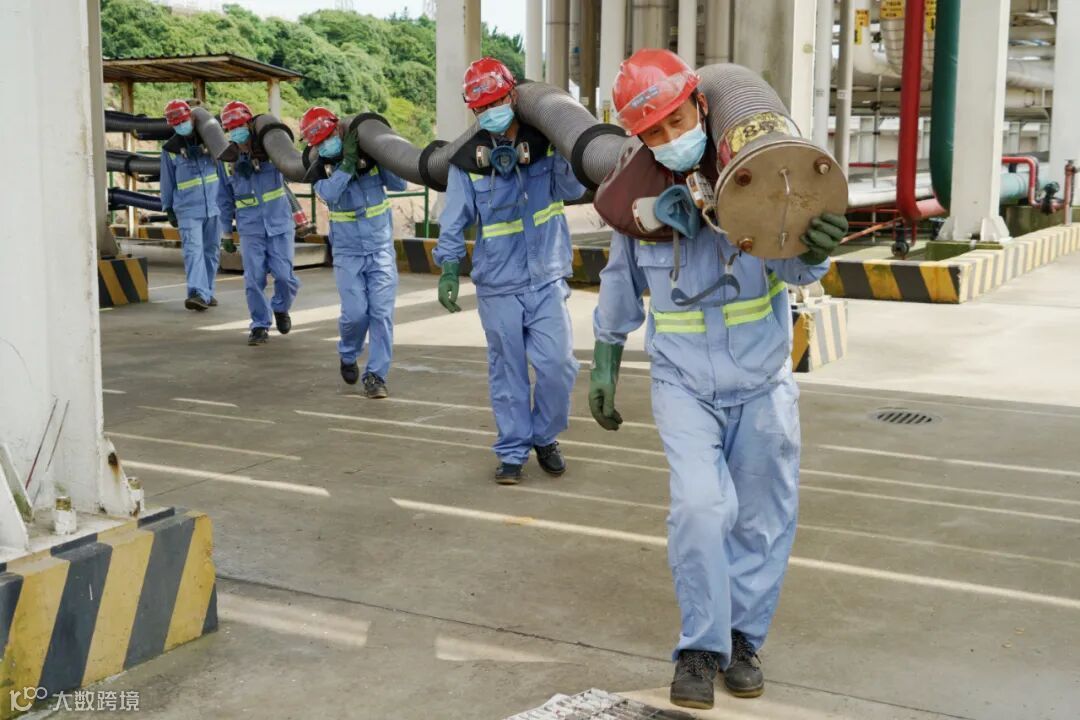 在满载着6500吨汽油的野华骏油冶轮稳稳靠泊后,镇司化工队码头班班员们全副武装,冒着酷暑,第一时间将长达10米、重300 余斤的复合软管扛到物料管道接口处,进行接卸前的管道连接工作。