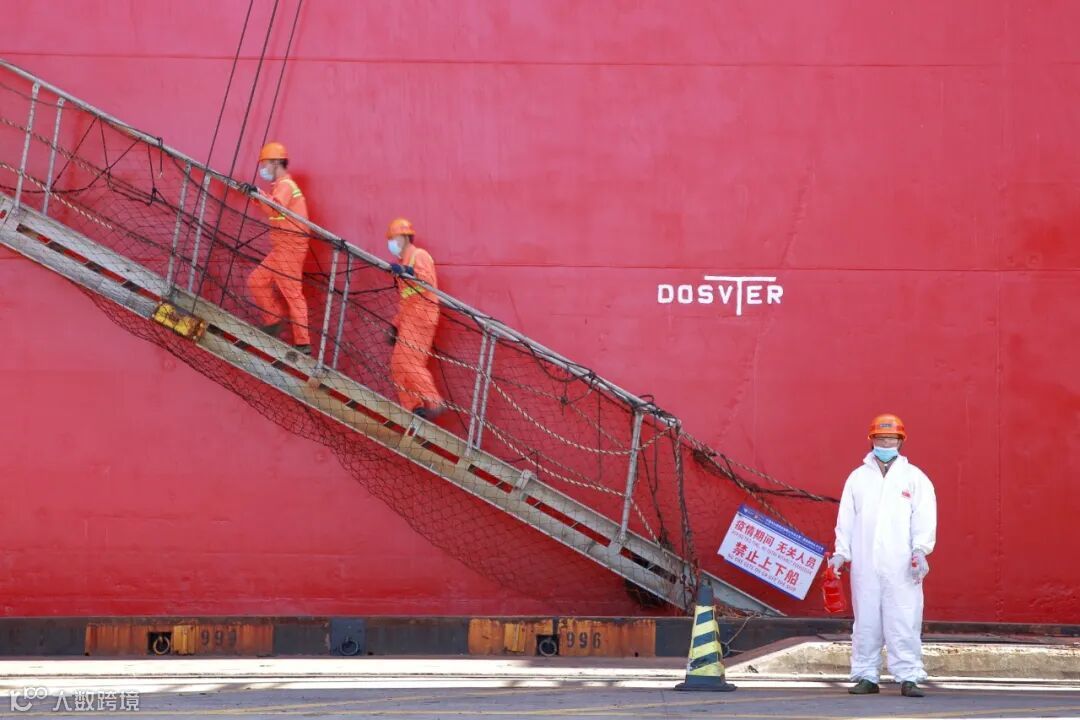高温下,北二集司码头梯口值班人员身着全套防护装备,手持消毒喷壶,值守在外轮舷梯口,守护着港口安全。