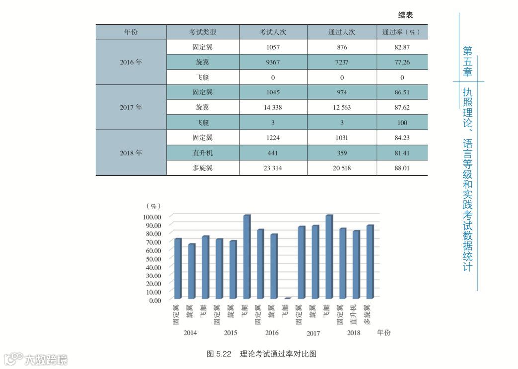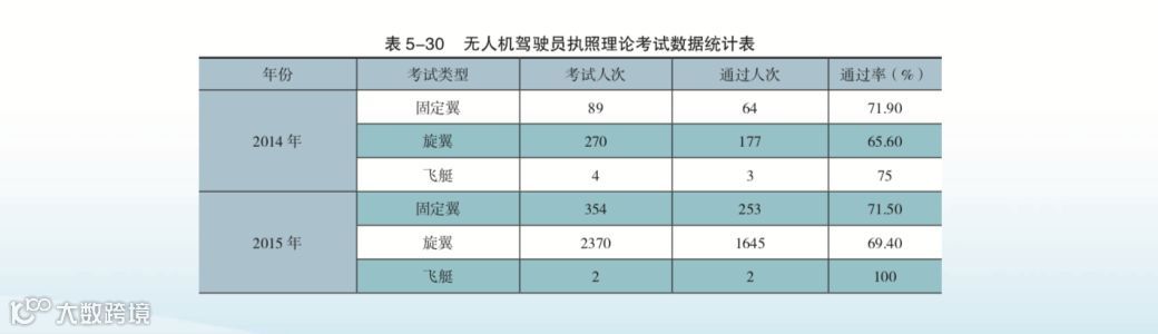 无人机驾驶员执照理论考试从 2014 年 6 月开始实施,截至 2018 年 12 月 31 日, 无人机执照理论考试统计数据如表 5-30 所示。