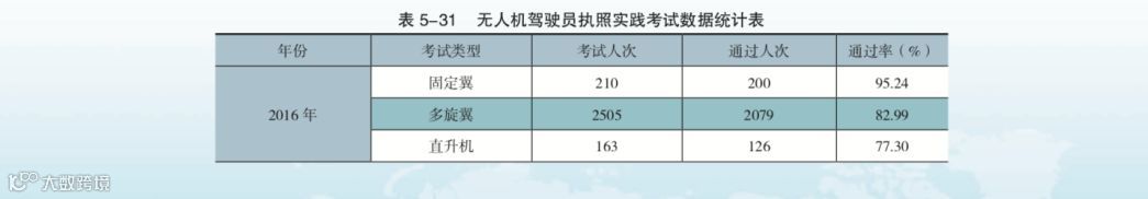 无人机驾驶员执照实践考试从 2016 年 6 月开始系统实施并记录统计,前期考试 工作仅截至 2018 年 12 月 31 日;无人机驾驶员执照实践统计数据如表 5-31 所示。