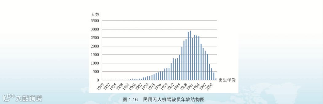 根据中国民用航空规章《民用航空器驾驶员合格审定规则》(CCAR-61 部)规定: 申请运动驾驶员执照需年满 16 周岁,所以申请无人机驾驶员执照需年满 16 周岁。而对于无人机驾驶员的年龄上限,一般情况下没有限制,无人机驾驶员的年龄结构如表 1-16 所示。