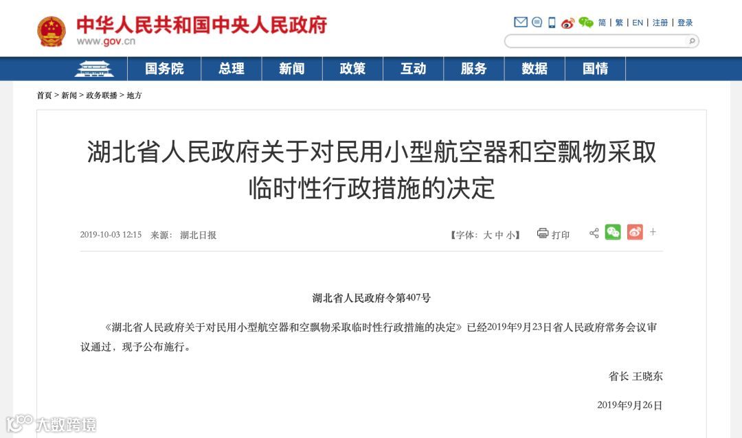 据武汉警方介绍,省人民政府近日出台了《关于对民用小型航空器和空飘物采取临时性行政措施的决定》(以下简称《决定》),为确保第七届世界军人运动会顺利进行,根据省人大常委会授权,决定自即日起至2019年10月31日,武汉、黄冈、孝感、鄂州行政区域内禁止民用小型航空器和空飘物施放,经依法批准用于电视转播、航拍、警务、应急救援、气象探测、植保防治等活动的除外。