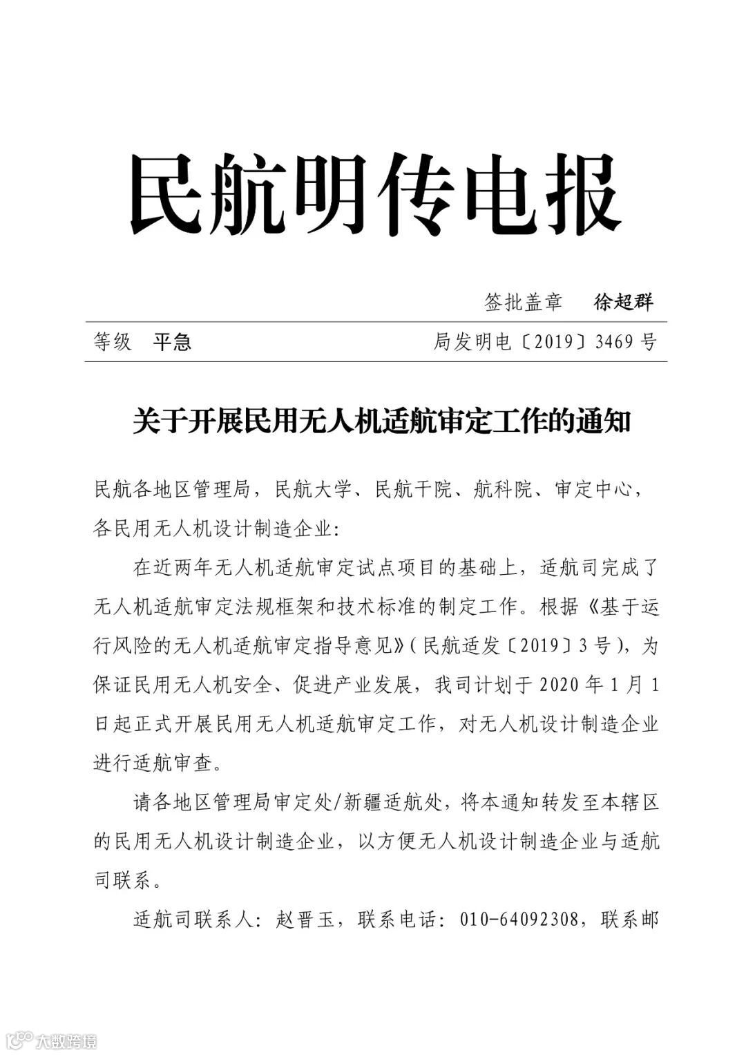 在近两年无人机适航审定试点项目的基础上,适航司完成了 无人机适航审定法规框架和技术标准的制定工作。根据《基于运 行风险的无人机适航审定指导意见》(民航适发〔2019〕3 号),为保证民用无人机安全、促进产业发展,我司计划于 2020 年 1 月 1 日起正式开展民用无人机适航审定工作,对无人机设计制造企业进行适航审查。