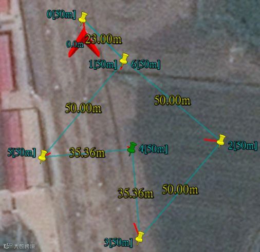以下图为例,起飞点位于①号航点NW方向23米处,飞机飞到②号航点后以220度方向飞向③号航点,航点高度30米,1.2、2.3、1.5边长50米,请在地面站中做出此图形。