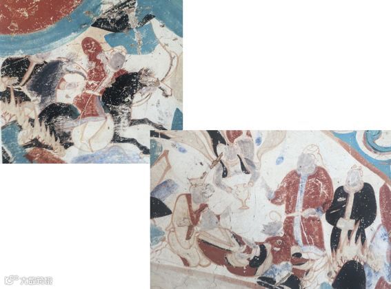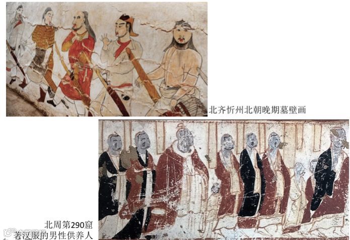 比如,上图中的北齐壁画中,人们是胡风装束—因北齐统治者不满孝文帝改革,发动政变分裂了北魏建立北齐,力求恢复鲜卑文化。而北周的壁画,则延续了北魏深受儒家文化影响的恭肃有礼的风格。
