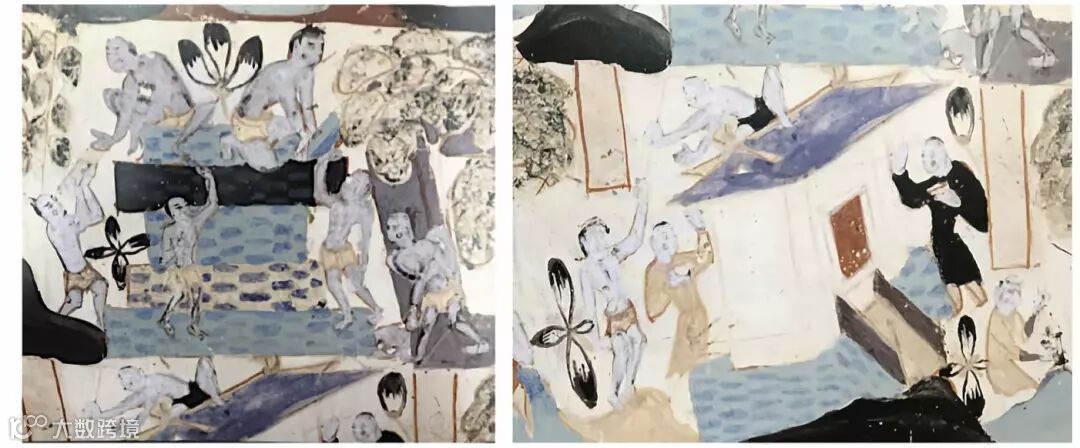 而这创作的过程,在壁画中亦有所体现。如北周第296窟“福田经变”,还原的便是壁画制作时的场景。运送建筑材料或是建造寺庙的工人、蹲着调制颜料的助手、端着盘子作画的画师,均有所表现。