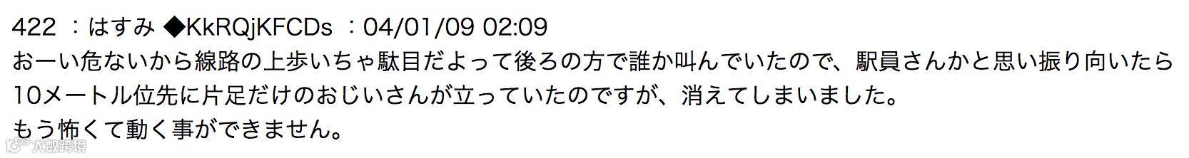 “‘喂!在铁道上走是很危险的哦’,后面突然有人说话。回头一看,约十米远处站着一个单腿老人,然后就消失了。我已经吓得动弹不得了。”