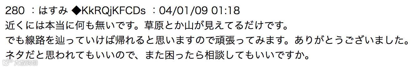 “这附近真的是什么都没有啊。只看见草原和山了。不过沿着铁轨走应该是能回到家的。今天真是谢谢大家了。我要是待会儿又碰上怪事了,不知道还能不能得到大家的支持呢。大家就当今天看了个故事好了。”