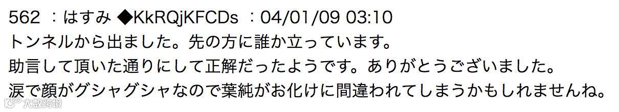 “我出隧道了。前面好像站着个人。谢谢大家的建议。泪水已模糊了视线,说不定在人家眼里我也像妖怪一样呢。”