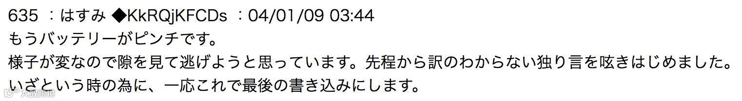 “电池已经不行了。情况实在太不对了。看情况我得准备逃跑了。从刚才开始嘴里就在不断跑出我一句也听不懂的话来。为了预防万一,最后先把这些话写在这里。”