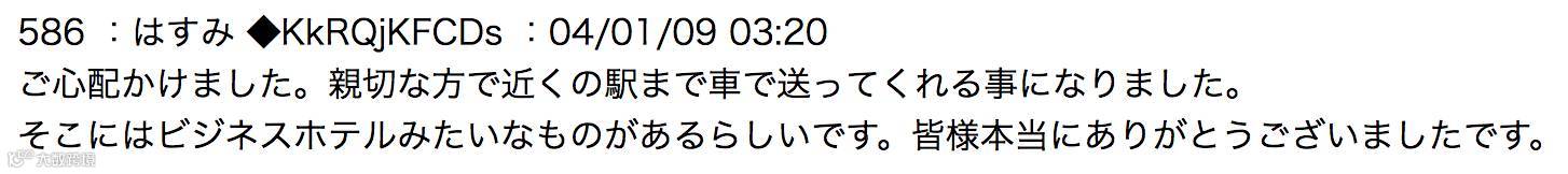 “让各位担心了。亲切的人说要开车送我到附近的车站。那似乎有类似商务旅馆的地方,真的非常謝謝各位。”