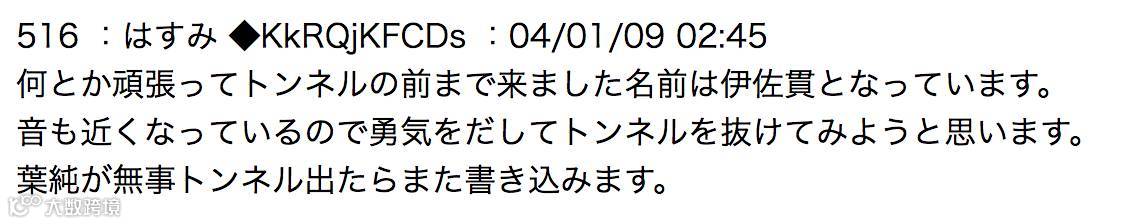 “总算走到隧道口了,隧道的名字叫伊佐贯。声音已经越来越近了,我只能鼓起勇气通过隧道。等我平安通过后再来发文。”