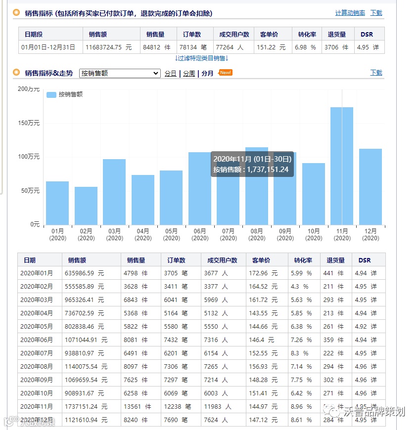 以我们其中一个天猫店铺2021年全年数据为例来跟大家分享,这样的品牌我们有5个10多家店铺,年产值近亿,主要是京东和天猫中高端。