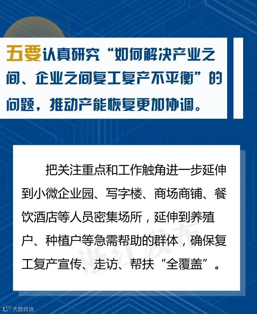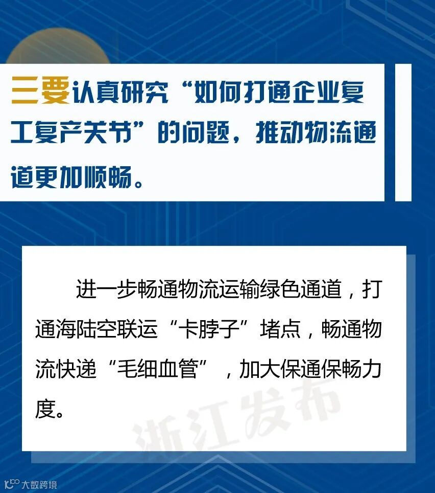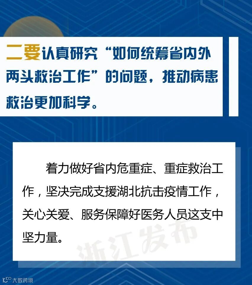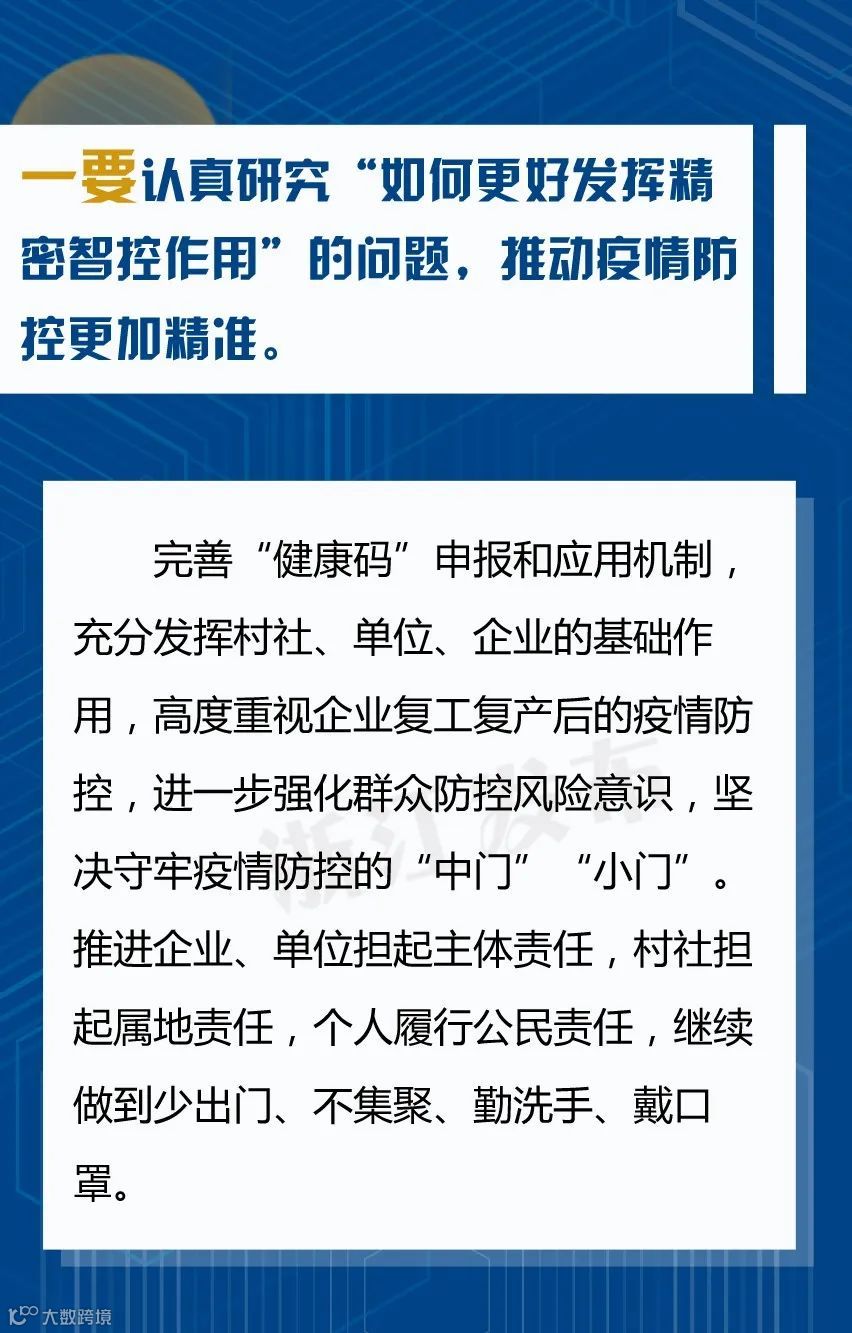 会上省委书记车俊强调,要坚持问题导向、强化精准施策,推动疫情防控和经济社会发展工作朝细处、实处、深处抓。各市县要认真落实分区分级精准防控的要求,根据疫情图和“三返”情况,尽快全面恢复经济社会发展秩序,推动复工复产应复尽复,加快实现全面复工复产,确保疫情防得住、发展搞得好。重点要“认真研究十个问题、做到十个更加”: