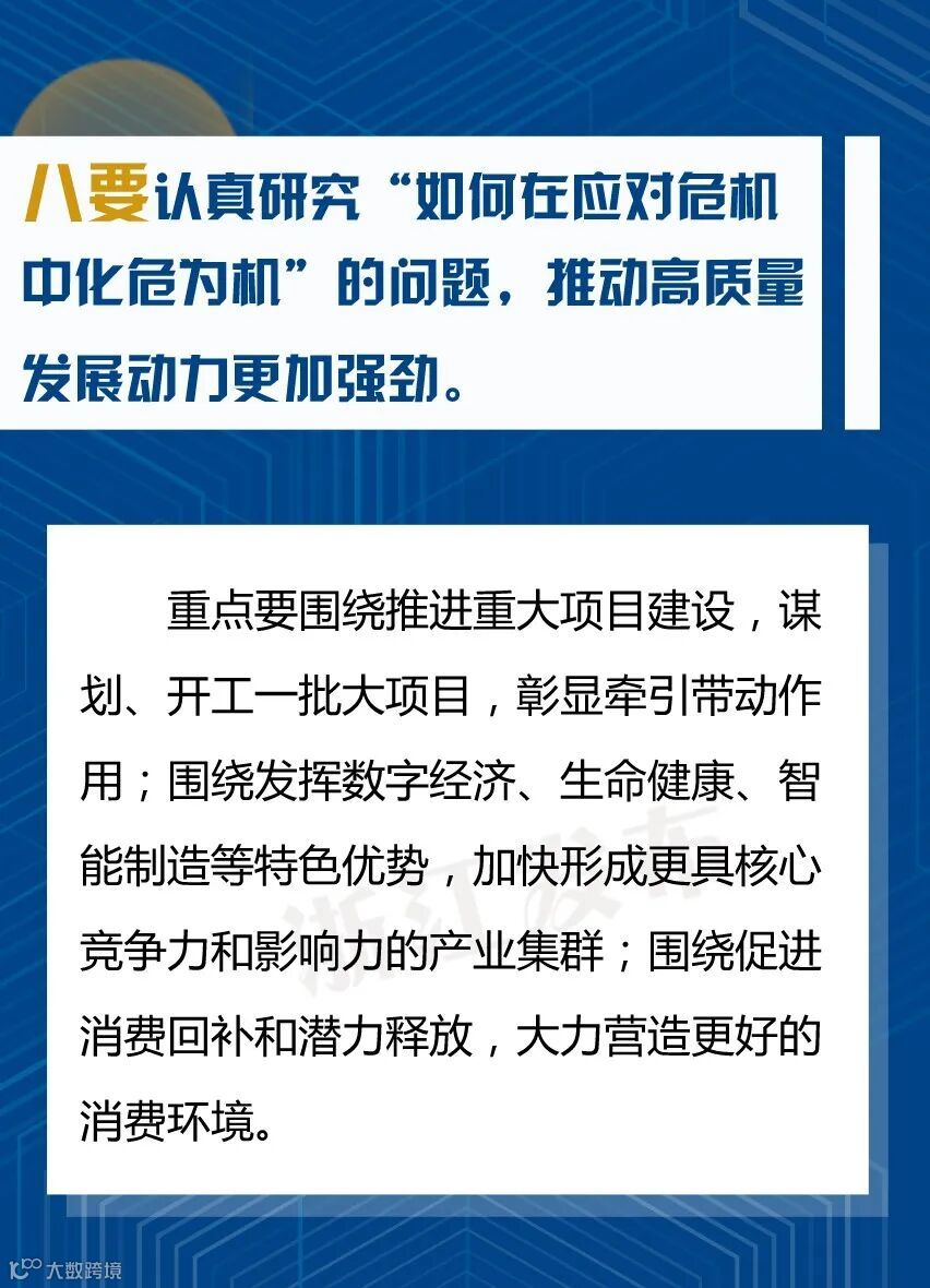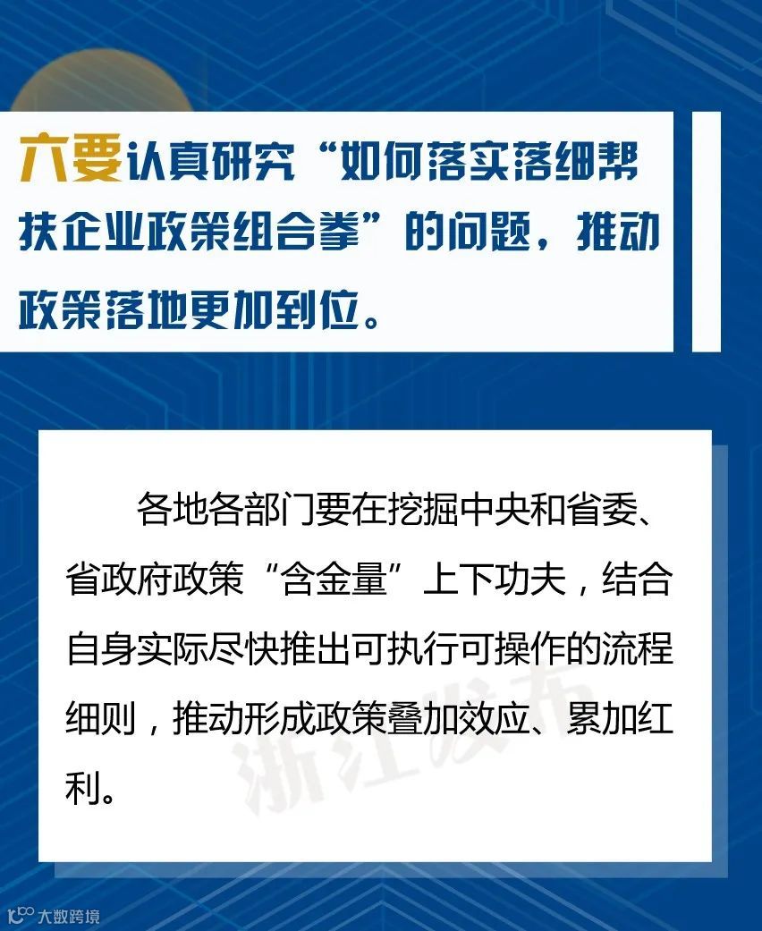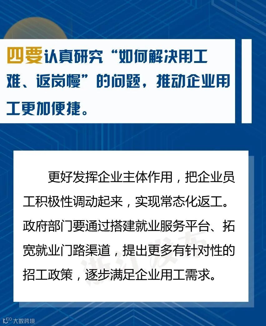 会上省委书记车俊强调,要坚持问题导向、强化精准施策,推动疫情防控和经济社会发展工作朝细处、实处、深处抓。各市县要认真落实分区分级精准防控的要求,根据疫情图和“三返”情况,尽快全面恢复经济社会发展秩序,推动复工复产应复尽复,加快实现全面复工复产,确保疫情防得住、发展搞得好。重点要“认真研究十个问题、做到十个更加”: