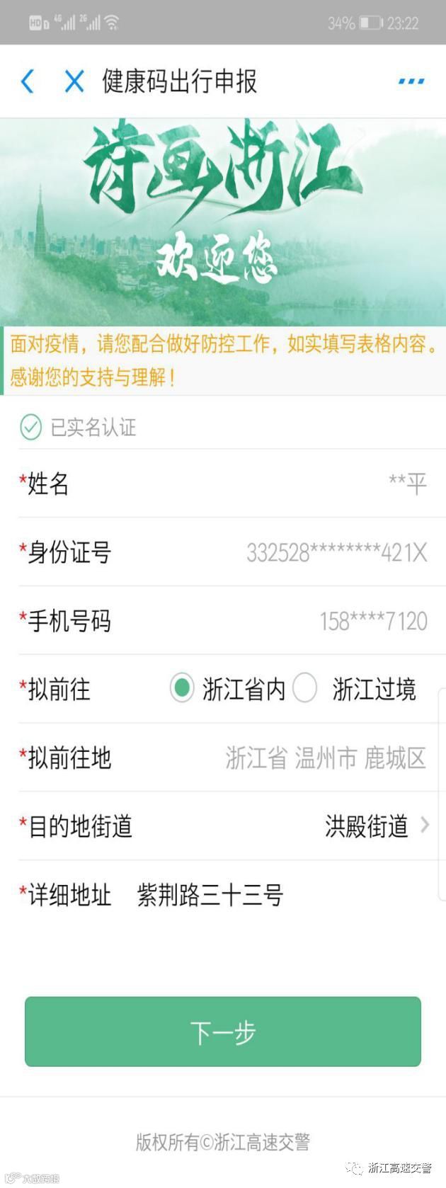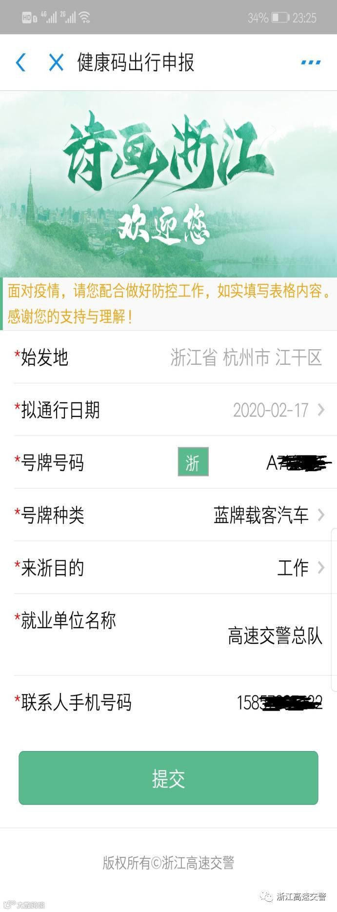 或通过支付宝搜索关注“浙江高速交警“生活号,进入到“健康码出行申报”界面后按提示操作。