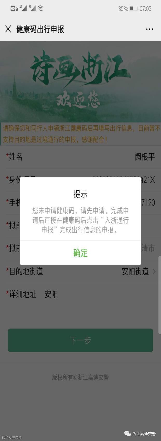 通过“支付宝”APP进行申领的,系统自动获取支付宝实名认证信息,选择拟前往浙江省内或浙江过境和目的地详址后,系统后台自动验证是否已申请“健康码”,未取得落地“健康码”的,系统将弹出窗口提示,点击“确定”跳转到申请“健康码”界面;已领取“健康码”的,系统直接跳转到申报界面。