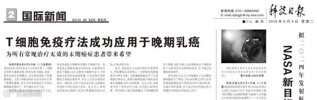 科技日报6月5日报,英国《自然·医学》杂志4日在线发表了一项癌症学研究重磅进展:利用自身T细胞,美国一患者免疫系统调整后,完全彻底清除了乳腺癌细胞。