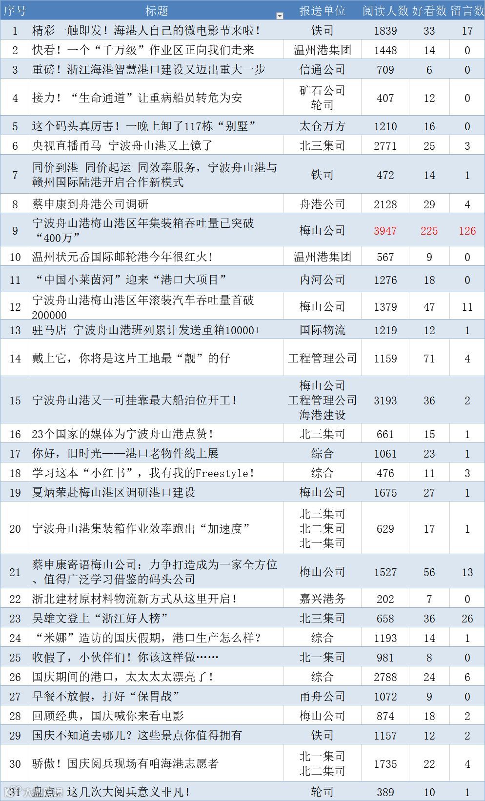 2019年10月份,“浙江海港”微信公众号录用基层单位稿件的传播数据新鲜出炉。最受读者关注的基层稿件有哪些呢?一起来看看吧!