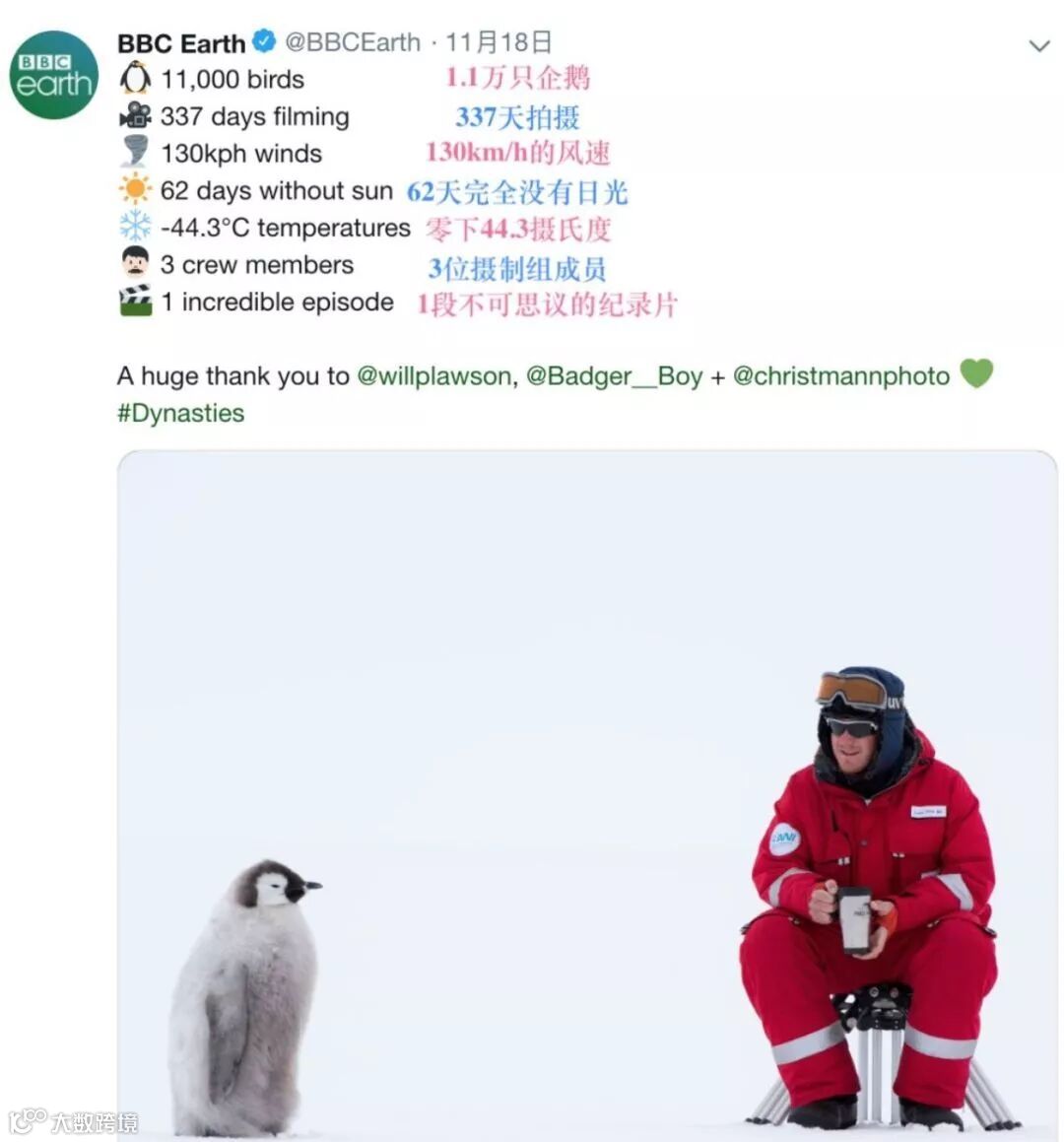 豆瓣评分:9.5分 豆瓣网友“wendydu”评价:“看完非常感动,沙砾中的花,雪地里的鹦鹉,森林里的企鹅,还有一群真心热爱动物的摄影师。”