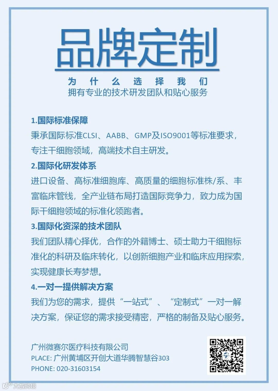 广州微赛尔医科技有限公司是一家专注于干细胞领域为大众健康提供服务,拥有专业的技术研发团队和贴心的服务。微赛尔可以根据客户对细胞、外泌体、仪器设备等相关需求,共同研制开发细胞系列产品,定制化服务,有意向且真实需求可以垂询。