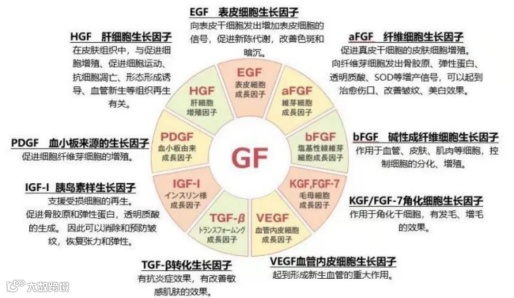 EGF(表皮细胞生长因子):促进皮肤细胞的产生,促进机能恢复