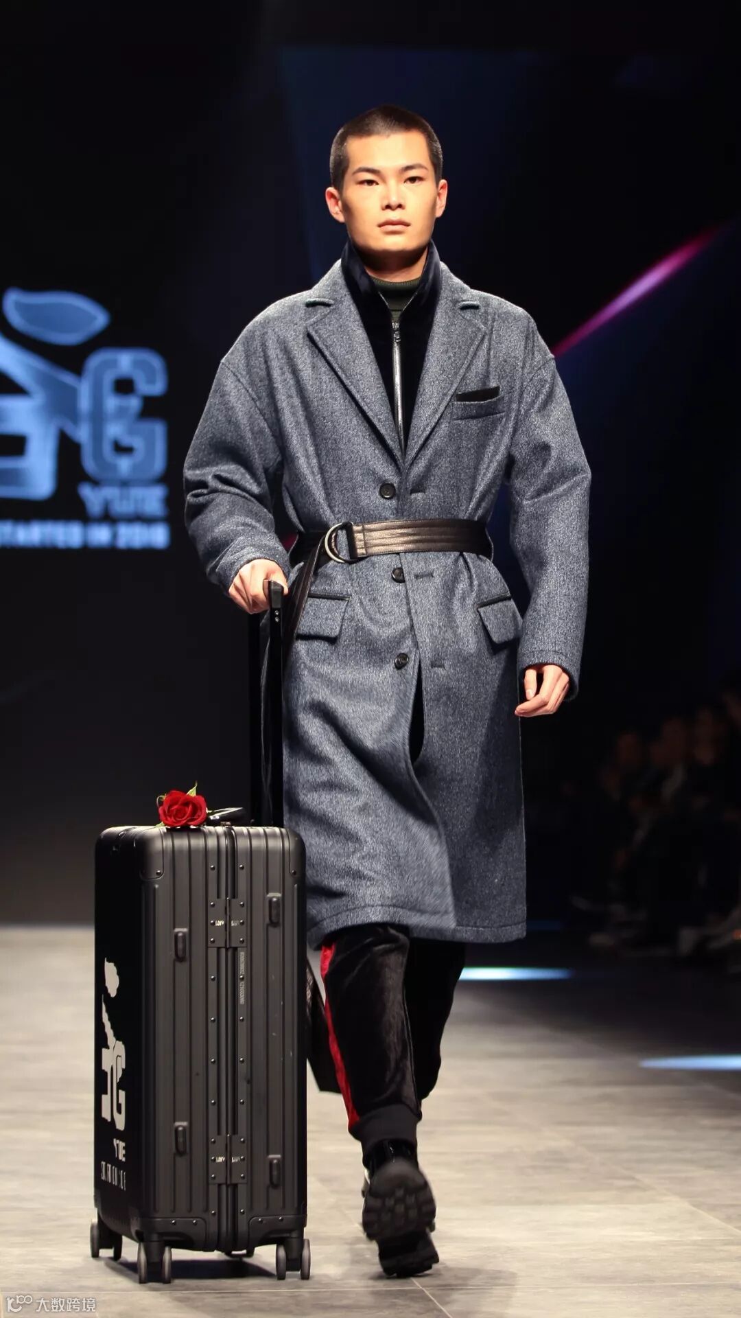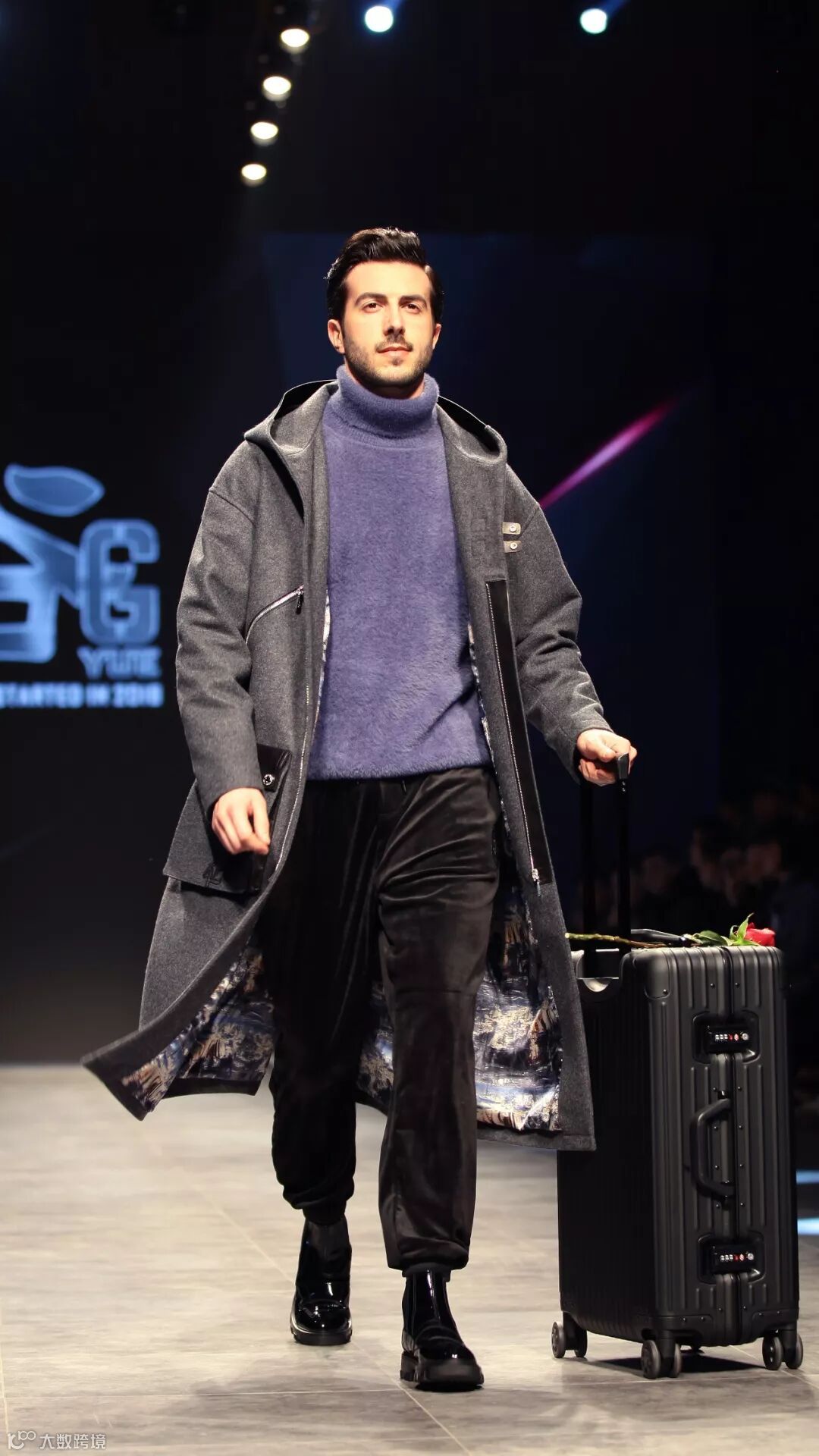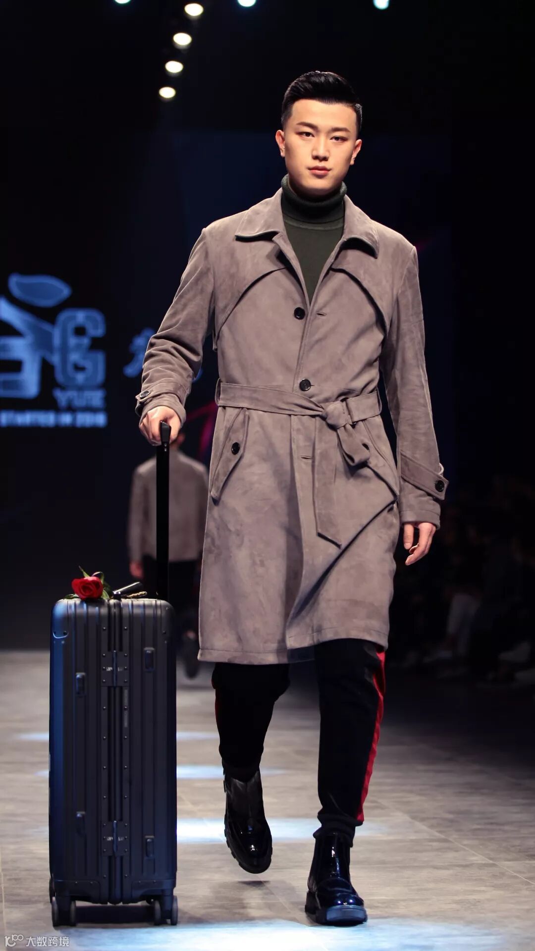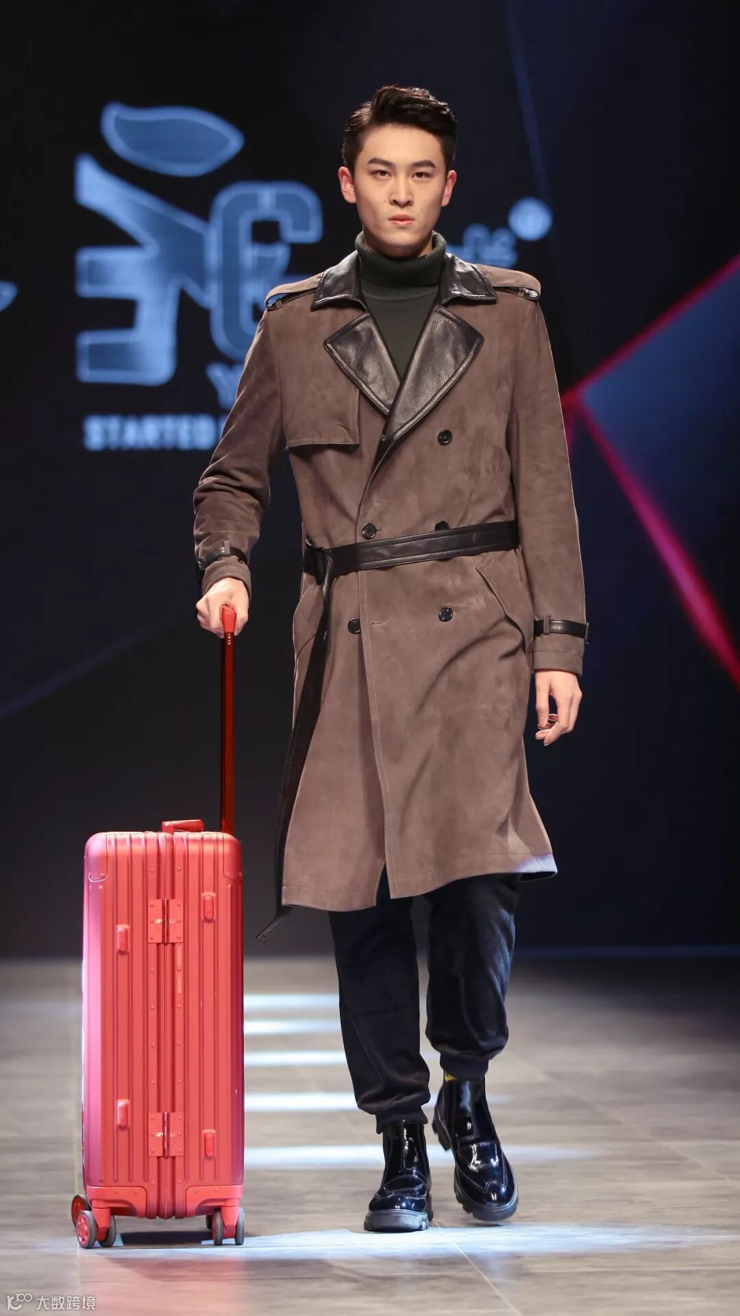 模特踩着节奏、拖着行李箱踏步而来