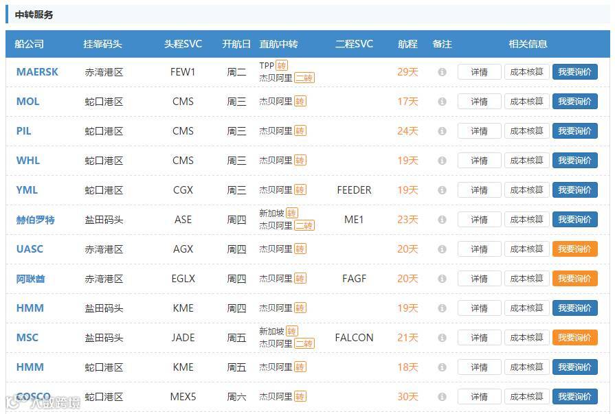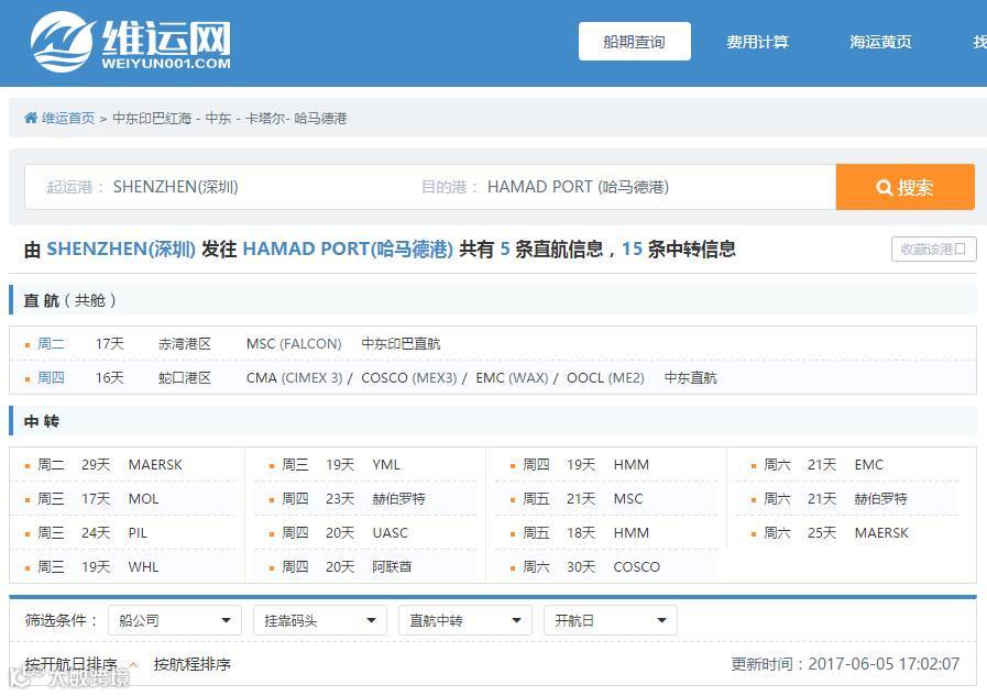 请观看一组来自维运网船期数据:中国深圳港到卡塔尔哈马德港集装箱船期